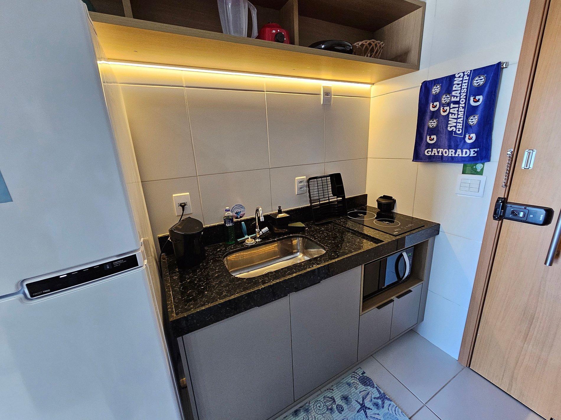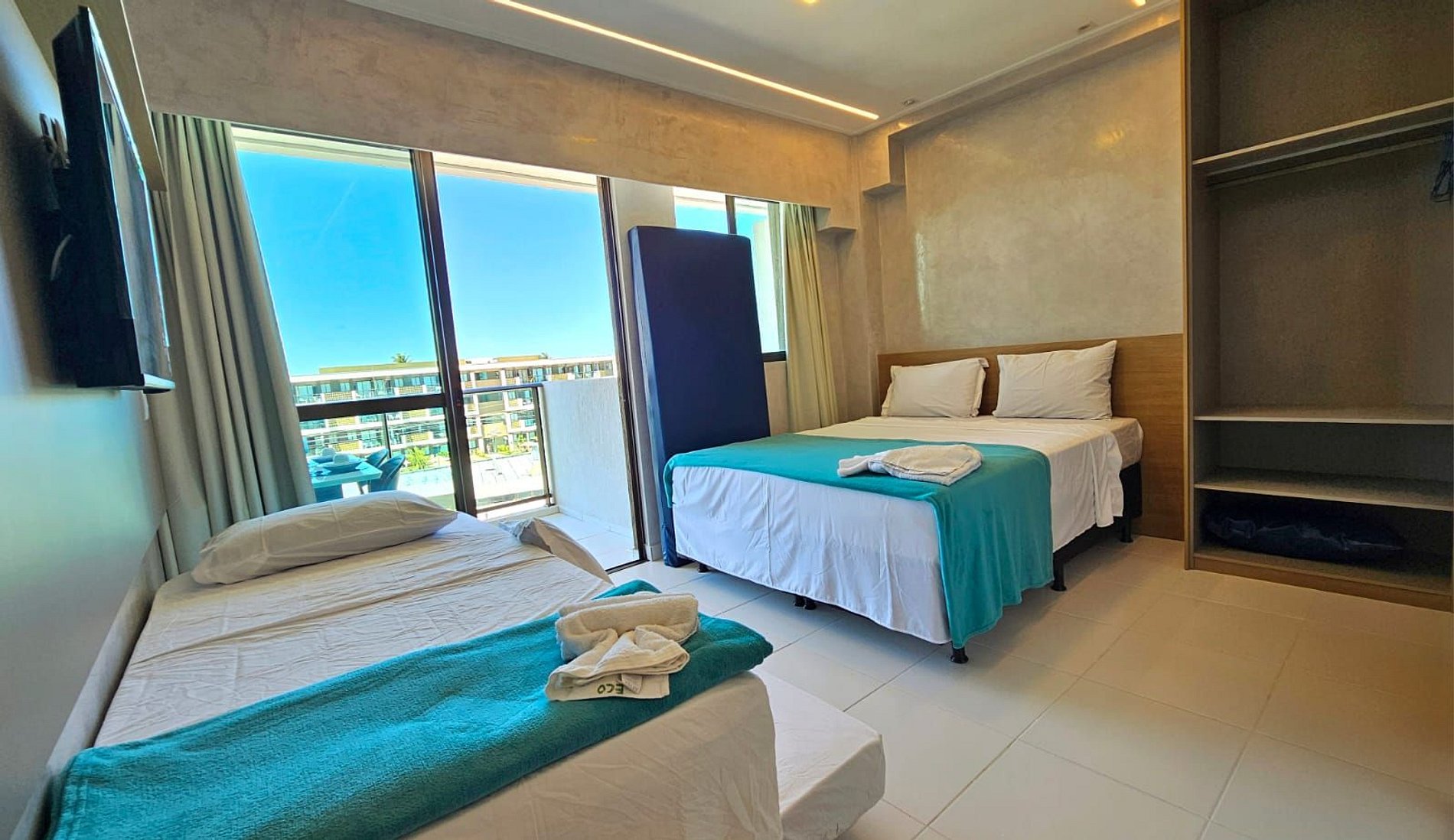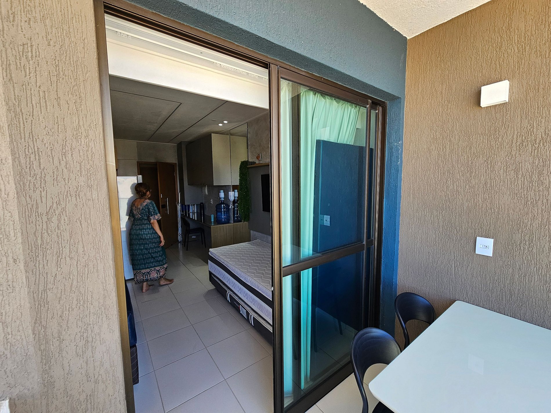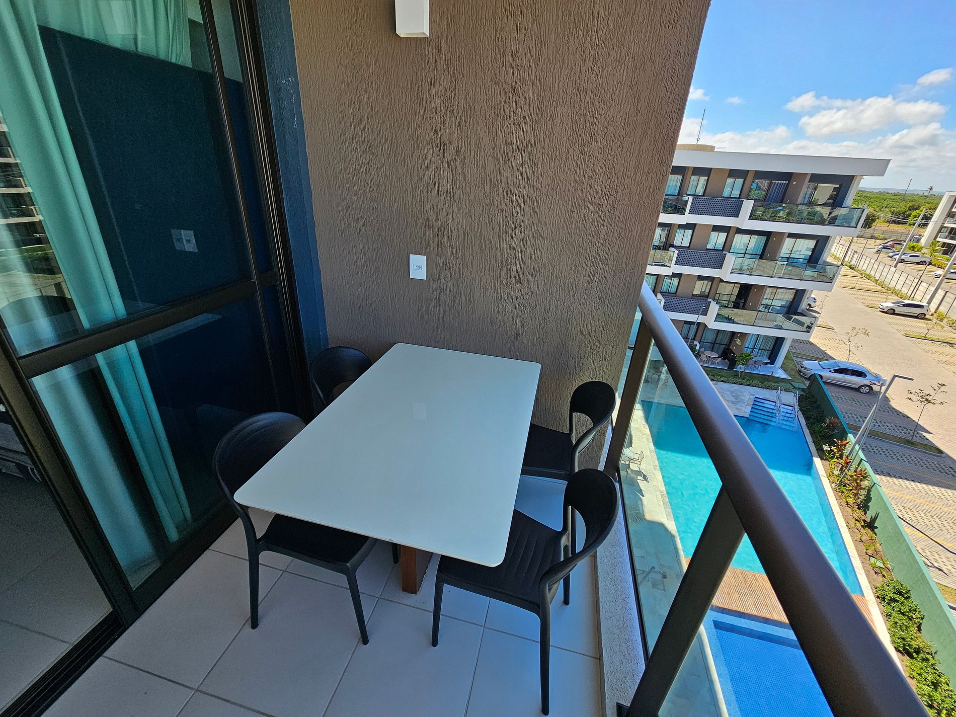 Trata-se de uma estadia com o aconchego de um apartamento bem estruturado com um quarto climatizado, banheiro, cozinha completa, varanda com vista para a piscina piscina do bloco, Wi-fi no apartamento, spliter 18.000 BTUs.